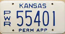 PWR Permanent Application | 2001 - 2006 | Embossed blue serial on white plate with "PWR" at left; "KANSAS" and "PERM APP" in red at top and bottom, respectively | 123456 | Used for commercial machinery such as semi-trucks, road construction equipment, dump trucks, etc. where a permanent application is needed |