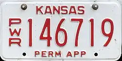 2006 - 2018 | Embossed red serial on white plate with "PWR" at left; "KANSAS" and "PERM APP" in red at top and bottom, respectively | |||