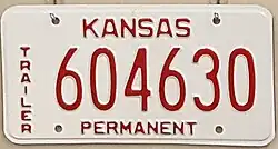 2018–present | Flat black serial on white plate with "TRAILER" at left; "KANSAS" and "PERMANENT" in red at top and bottom, respectively | |||