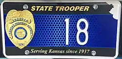 December 2016 – Present | Embossed white serial on blue plate with Kansas Highway Patrol badge at left, "STATE TROOPER" and "Serving Kansas since 1937" in gold at top and bottom, respectively. | 123 | The Kanas Highway Patrol replated their entire fleet in late 2016 with these blue and gold plates in preparation for their 80th anniversary in 2017. |