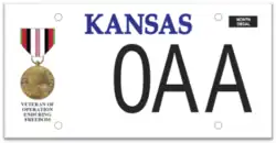 Operation Iraqi Freedom | 2018–present | Screened black serial on white plate with Iraq Campaign Medal graphic at left; "KANSAS" in blue at top | AB1 | Must have been awarded the Iraq Campaign Medal. |