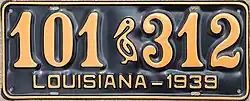 | 1939 | Embossed orange serial with pelican separator on black plate with border line; "LOUISIANA–1939" centered at bottom | none | 123-456 | Issued in blocks by horsepower class and branch office | ||