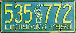 1953 | Embossed yellow serial with pelican separator on green plate with border line; "LOUISIANA-1953" at bottom | none | 123-456 | 1-001 to approximately 638-000 | |
