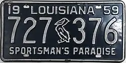 | 1959 | Embossed white serial with pelican separator on dark blue plate with border line; "19 LOUISIANA 59" at top | "SPORTSMAN'S PARADISE" at bottom | 123-456 | 1-001 to approximately 910-000 | ||