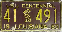 | 1960 | Embossed golden yellow serial with pelican separator on purple plate with border line; "19 LOUISIANA 60" at bottom | "LSU CENTENNIAL" at top | 123-456 | 1-001 to approximately 934-000 | ||