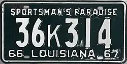 | 1966–67 | Embossed white serial on dark green plate with border line; "66 LOUISIANA 67" at bottom | "SPORTSMAN'S PARADISE" at top | 123A456 | Letter corresponds to State Police troop area of issue | ||