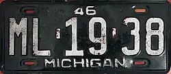 | 1946 | White on dark olive green; "MICHIGAN" at bottom and "46" at top | none | AB-12-34 | County-coded | ||