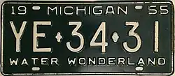 1955 | White on green; "19 MICHIGAN 55" at top | Water Wonderland | AB-12-34 | County-coded | |