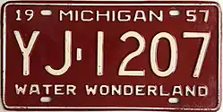 | 1957 | White on red; "19 MICHIGAN 57" at top | Water Wonderland | AB-1234 | County-coded | Front and rear plates issued (as from 1910–43); this practice continued until 1981. | |