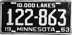 | 1953 | Embossed white serial on black plate with border line; "19 MINNESOTA 53" at bottom | "10,000 LAKES" centered at top | 123-456 1-234-567 |