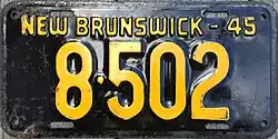 | 1945 | Embossed yellow serial on black plate; "NEW BRUNSWICK - 45" at top | none | 12·345 | 1·000 to approximately 30·500 | ||