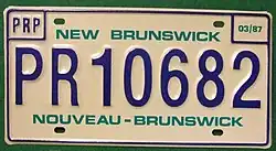 1986 | Embossed blue serial on reflective white plate; border lines around plate and around top corners; "NEW BRUNSWICK" and "NOUVEAU-BRUNSWICK" screened in turquoise centred at top and bottom respectively | none | PR12345 | PRP Plan | |