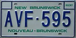 1986–89 | Embossed blue serial on reflective white plate; border lines around plate and around top corners; "NEW BRUNSWICK" and "NOUVEAU-BRUNSWICK" screened in turquoise centred at top and bottom respectively | none | ABC-123 | AAA-000 to approximately ARZ-999 | |