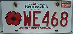 2021-present | Embossed red serial on reflective white plate with curved gold and sky blue bands at the top; screened provincial wordmark (red galley graphic with small blue waves and "New" to the left, "Nouveau" to the right and "Brunswick" and "CANADA" below, all in green) on bands, centred above serial with red poppy to the left of serial | "VETERAN / ANCIEN COMBATTANT" | WAB01 | WAA01 to WAX19 (As of November 30, 2023)[6] |