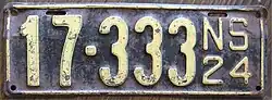 1924 | Embossed yellow serial on black plate with border line; "NS 24" at right | 12-345 | 1-001 to approximately 19-000 | |