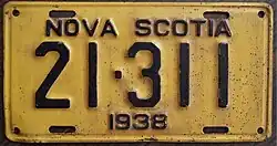 1938 | Embossed black serial on yellow plate; "NOVA SCOTIA" and "1938" centred at top and bottom respectively | 12-345 | Coded by county group (1) | |