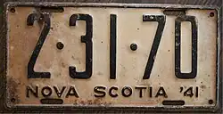 1941 | Embossed black serial on cream plate with border line; "NOVA SCOTIA '41" at bottom | 1-23-45 | Coded by county group (1) | First 6" x 12" plate. |