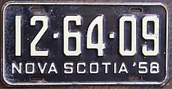 1958 | Embossed light yellow serial on black plate with border line; "NOVA SCOTIA '58" at bottom | 1-23-45 12-34-56 |