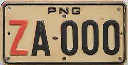 Red Z plates are issued to motorcycles owned by the Papua New Guinea Government. Originally made from steel, and commencing at ZA-000 in 1975. In late 2024, ZA-000 to ZA-015 were issued to Traffic Police motorcycles in Port Moresby. These newer plates were made of pressed aluminium. |
