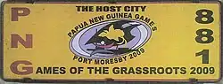 | Special plates were manufactured by Pacific Personalised Plates for the 4th Grassroots Games held in Port Moresby from 17 to 28 November 2009. 88 pairs were issued. |