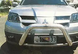 Papua New Guinea] (Papua Niugini in Tok Pisin) requires its residents to register their motor vehicles and display vehicle registration plates.[1] Motor vehicle registration is the responsibility of Motor Vehicle Insurance Limited (MVIL). Current plates are in two styles; Australian standard 372 mm × 134 mm, and use Australian stamping dies, and what is commonly referred to as "Euro Flag" style. The latter has the flag of Papua New Guinea and often a provincial flag from Morobe or Madang Province on the left. The stamping dies are German FE style.[2] Commencing in April 2025, flag style plates were no longer offered, reverting back to the standard Australian style. This commenced at LCG-000. Since the mid 1990s, plates have been issued with the first letter identifying the province of issue. As of 2025, most private and commercial motor vehicles use standard white plates with black lettering. Special number plates are issued to Consular staff, Diplomatic staff, Government owned vehicles, motorcycles, public motor vehicles (buses), taxis, trailers and to those engaged in selling or repairing vehicles. Especially in the provincial areas, many vehicles feature either just one plate, or a home-made alternative to replace a missing officially issued plate.
