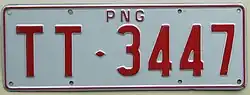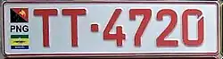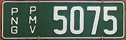 | Registration plate used motorcycles belonging to the National Government of Papua New Guinea. Introduced in 1975 to reflect independence from Australia. | ![]() |