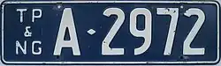 General issue type used in the Territory of Papua and New Guinea. TP&NG1 to TP&NG82-999. Introduced in 1951. Early plates were made by the issuing authority from kits. From about TP&NG3-000 were in the Australian style. Plates from TP&NG10-000 to TP&NG13-999 featured a black border. | ![]() |