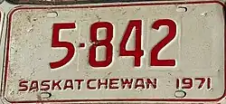 1971 | Red on reflective white; "SASKATCHEWAN 1971" at bottom | none | 123-456 | 1 to approximately 325-000 | |