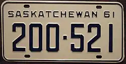 1961 | Dark blue on white; "SASKATCHEWAN 61" at top | none | 123-456 | 1 to approximately 248-000 | |
