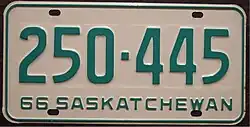 1966 | Green on white; "66 SASKATCHEWAN" at bottom | none | 123-456 | 1 to approximately 291-000 | |