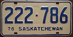 1976 | Blue on reflective white; "76 SASKATCHEWAN" at bottom | none | 123-456 | 1 to approximately 383-000 |