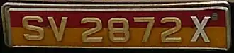 Vehicles registered as "Off-peak Vehicles", colloquially known as "weekend cars" or red plate, pay a cheaper annual road tax compared to ordinary private cars, and rebates towards the registration of Certificate of Entitlement (COE) and Additional Registration Fee (ARF) on a new vehicle purchase.[26] Off-peak vehicles display number plates with white characters on a red background and are held with a tamper seal at the corner, bolted onto the bumper beam frame or the trunk itself. They are also not to be confused with the preserved vehicle licence plate format for de-registered vehicles.