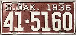 1936 | Embossed white on brick red with border line; "S. DAK. 1936" at top | none | 1-1234 10-1234 |