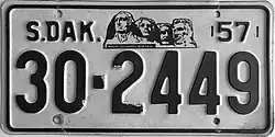 | 1957–59 | Embossed black on reflective white with border line; "S.DAK.", stamped Mount Rushmore graphic and "57" at top | none | 1-12345 10-1234 |
