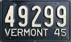 | 1945 | Embossed white serial on dark blue plate; "VERMONT 45" at bottom | none | 12345 | 1 to approximately 81000 | ||