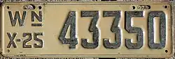 1925 | Embossed dark blue serial on white plate; "WN X-25" at left | none | 123456 | 1 to approximately 282000 | |