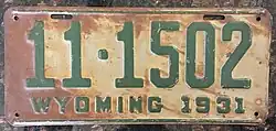 1931 | Embossed green serial on gray plate; green lines at top and bottom borders; "WYOMING 1931" at bottom | 1-1234 10-1234 |