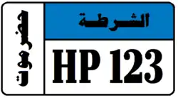 Hadhramaut Governorate License Plates consist of black text and black boundary on white background. Hadramaout Governorate plates consist of the governorate name in Arabic (حضرموت) and a 4 digit number. Hadramaut Governorate plates also have a strip on the left hand side with the letter H in black on a background whose color depends on the classification of the vehicle. Temporary plates have a strip on the right hand side that says "مؤقت", meaning temporary, on a blue background. The license plates for Hadramout use a unique serif font.[4]