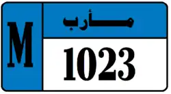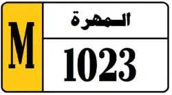 Marib Governorate License Plates consist of black numbers and black boundary on white background. Marib Governorate plates consist of the governorate name in Arabic (مأرب) and a 4 digit number. The governorate name is black on a background whose color depends on the classification of the vehicle. Marib Governorate plates also have a strip on the left hand side with the letter M in black on a background whose color matches the background color governorate name, and depends on the classification of the vehicle. The styles of Marib license plates thus differ from the previously mentioned southern governorates. The letter code used by the governorate, M, is the same as the letter code used by Al Mahrah Governorate. The license plates for Marib use a unique serif font.[6]