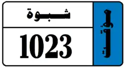 Starting from February 2020, Shabwah Governorate joined with Hadhramaut Governorate in issuing license plates in this new format and appearance. Similar to Hadhramaut, Shabwah License Plates consist of black text and black boundary on white background. Shabwah Governorate plates consist of the governorate name in Arabic (شبوة) and a 4 digit number. Shabwah Governorate plates also have a strip on the left hand side with the letter W in black on a background whose color depends on the classification of the vehicle. Temporary plates have a strip on the right hand side that says "مؤقت", meaning temporary, on a blue background. The license plates for Shabwah use a unique serif font.[7]