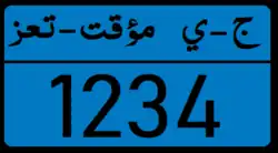 Unlike the aforementioned governorates, Taiz Governorate has not replaced the previous and other existing registration plates with a uniform new format like the rest of southern Yemen but uses the Mandatory typeface for numerals and Square Kufic for Arabic text since 2018.[1] Taiz Governorate traffic police have introduced two classes of "Temporary" License plates for vehicles missing a license plate. It is unclear how long such temporary plates will remain in circulation and what format will replace them, but they are de facto the current license plate format issued by the governorate.[8] Taiz temporary license plates have a top row that states "ج - ي" (J.Y.), standing for "Republic" and "Yemen" in Arabic. There is also the text "مؤقت - تعز", meaning "Temporary" and "Taiz", the name of the governorate.