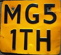Trader plates, used by automotive companies to register current stock under their insurance, these plates are to be used if the car is used for a test drive and has no insurance on its license plate. It is forbidden to park a car on the public road with trader plates fitted. | ||
