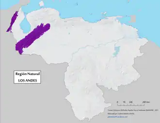 The Venezuelan Andean system represents the terminal bifurcation of the Cordillera Oriental de Colombia, which in Venezuelan territory consists of two mountainous branches: the Sierra de Perijá, smaller, slightly displaced from southwest to northeast with 7,500 km2 in Venezuela; and a larger, frankly oriented Southwest to northeast with about 40,000 km2, the Cordillera de Mérida, commonly known as the proper Venezuelan Andes.[1] The highest point in Venezuela is located in this natural region.[2] It covers around 5.2% of the national territory, being the 4th largest natural region in Venezuela.