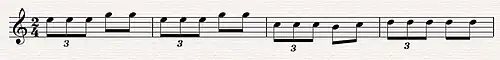 4 rhythm. The first half of the bar is written as an eighth-note triplet. The second half of the bar is written as two eighth notes. The unique swing in the second half is what gives Venezuelan merengue its lilt.