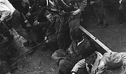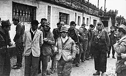 Morsero and Colonel Fracassi finally decided to accept the surrender conditions, challenged, however, by the officers,[40] who did not trust the partisans and were convinced they could hold out until the Allies arrived.[41] The same surrender conditions were accepted in the same hours by a nearby German garrison.[42] On the following day, April 28, the surrender of the column to partisan forces and the handing over of weapons, many of which were previously rendered unserviceable, took place. Prefect Morsero was picked up by the partisans and transferred to Vercelli, where he was imprisoned. The prisoners, separated from the women and children, were instead taken to Novara and locked up by the partisans in the Viale Alcarotti stadium, in those days used as a concentration camp.[43] During the transfer, despite the terms of the surrender even the officers were deprived of their weapons, which had been kept up to that point.[44]