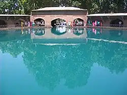 From the entrances, a walkway takes the visitor towards the octagonal pool, which is approached through a colonnade. This colonnade, composed of 24 arches, surrounds the pool, whose water comes from the spring deep below. The pool's water is clear and filled with carp. The water exits from the pool into the main axial water canal, which measures 305 meters long by 3.65 meters wide.[12]