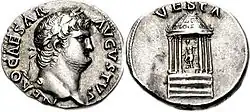 The temple of Vesta held not only the ignes aeternum ("sacred fire"), but the Palladium of Pallas Athena and the di Penates as well. Both of these items are said to have been brought into Italy by Aeneas.[51] The Palladium of Athena was, in the words of Livy: "fatale pignus imperii Romani" ("[a] pledge of destiny for the Roman empire").[52] Such was the Palladium's importance that when the Gauls sacked Rome in 390 BC, the Vestals first buried the Palladium before removing themselves to the safety of nearby Caere.[48] Such objects were kept in the penus Vestae (i.e., the sacred repository of the temple of Vesta).[53]