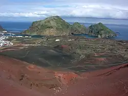 Heimaklettur seen from the top of Eldfell Volcano which erupted 23 January 1973
