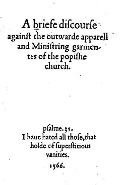 Title page to A Briefe Discourse Against the Outwarde Apparel of the Popishe Church (1566)