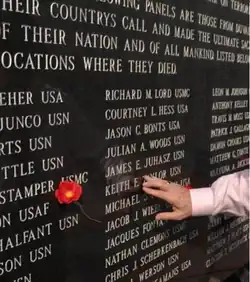 An additional 2,500-pound (1,130 kg) base and 5,000-pound (2,270 kg) panel were added in 2005 to provide space for those killed in Iraq and Afghanistan, but it became clear that the single panel would not be sufficient, based on the course of the war, so one more was added prior to the Memorial Day ceremony in 2010, the 15th anniversary of the monument. Ten names were added in 2010, four of which are on the most recent panel, which brings the total number to over 1,600. Four more names were added in 2014.[4]